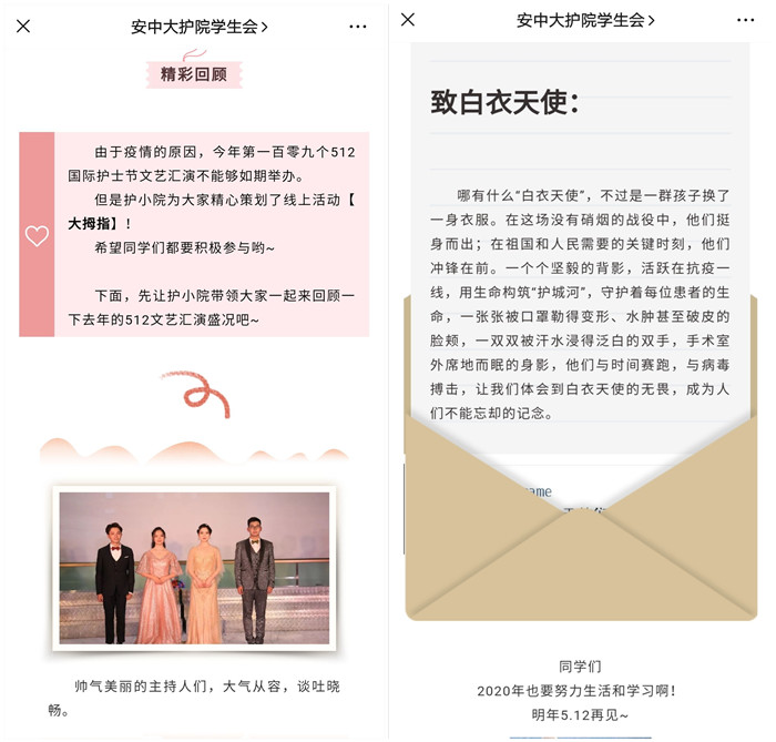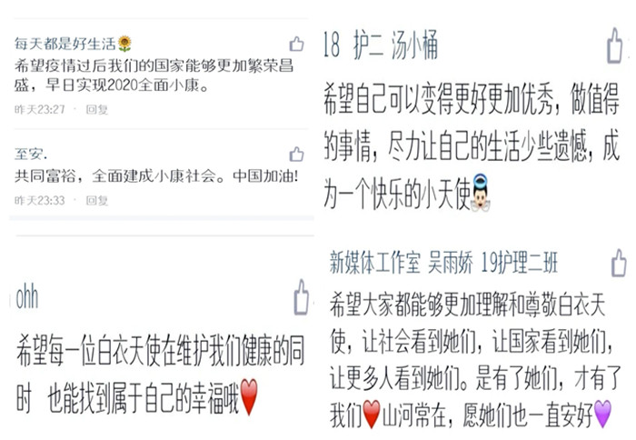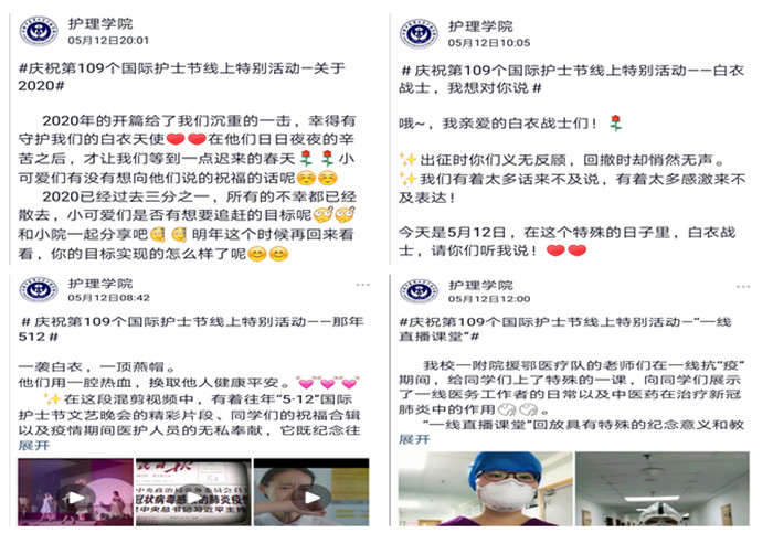 由于新型冠状病毒肺炎的影响,今年“5.12”国际护士节活动以特殊的形式在线上开展。学院官方QQ于5月11日推出视频“不一样的护士节”和“抗‘疫’,我们一直在”,为系列活动拉开帷幕。晚间,开始了线上互动——天使之“问”,吸引广大师生参与活动。护士节当日一早,官方QQ首先发布“那年512”的纪念视频,回顾品牌活动——512国际护士节文艺晚会和“天使之约”校园文化艺术节的精彩瞬间;随后,官方QQ推出祝福视频——“白衣战士,我想对你说”,各地宅家的同学们纷纷表达了自己对此次疫情中逆行白衣战士的敬意;午时,分团委通过官方QQ,号召全院学生集体回顾了“一线直播课堂”,“一线直播课堂”是学校一附院援鄂医疗队的老师们于前线为同学们上的特殊一课,分享了抗“疫”一线医务工作者的日常,同时展现了中医药在抗击新冠肺炎疫情中的巨大作用;晚间,官方QQ发表互动话题——“关于2020”。面对这样特别的一年,同学们都有很多话想说,有的分享了自己2020年的愿望,有的为自己制定了新的目标,有的表达了作为一名护生的自豪之情,有的表达了党和国家带领全国人民战胜疫情的信心。同时,微信公众号与官方QQ同步发送此次活动的相关推文,此外,线上及时同步了附属医院的护士节活动,以此共同纪念这个特别的护士节。(新媒体工作室/文、图 吴成长/审核)