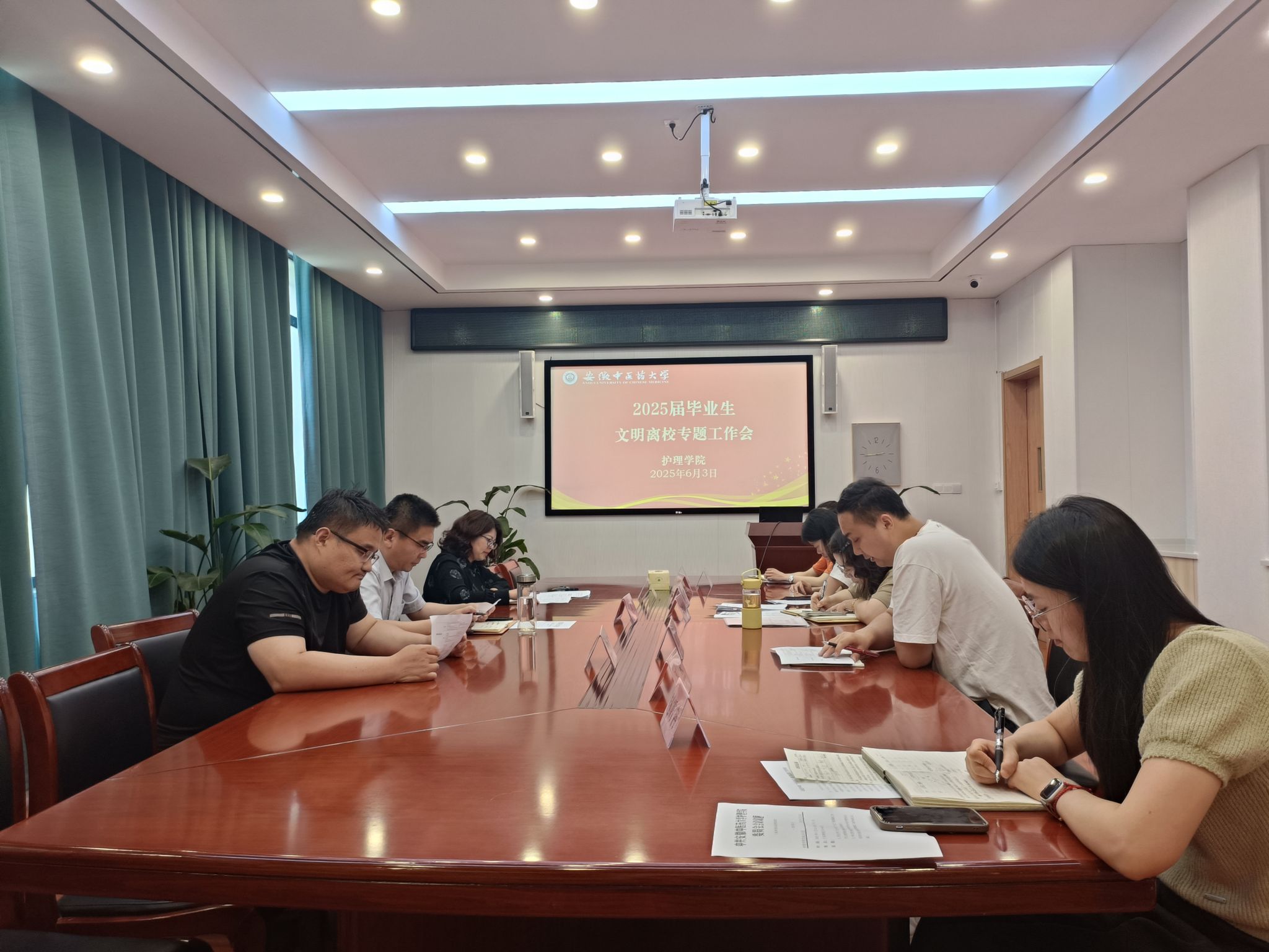 会议强调要落实好学校关于开展2025年毕业生文明离校教育工作要求,切实加强毕业生思想政治教育,加强文明离校宣传教育,引导学生以积极心态迎接毕业,营造良好的文明离校氛围。