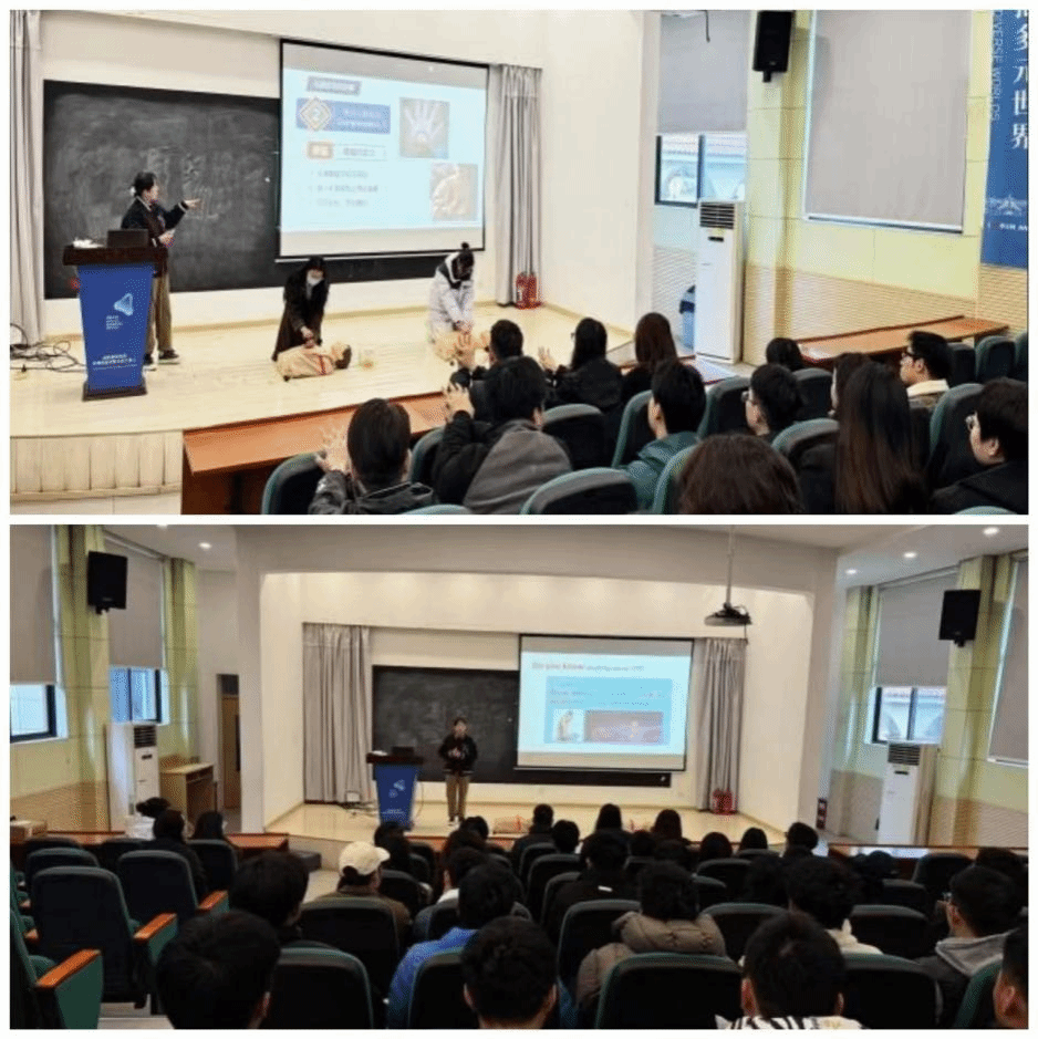 培训现场,志愿服务队通过理论讲解、示范演示和互动实操相结合的方式,深入浅出地讲解了心肺复苏的操作步骤,现场向大家演示了如何快速查找获取附近AED设备以及使用方式。此外,针对日常生活中常见的气道异物梗阻情况,研究生志愿者还详细讲解了海姆立克急救手法的操作要点。