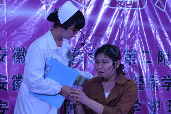 我班由王劼自创话剧《医者仁心》是第七个出场的节目。这个话剧主要讲述一个叫马冬梅的护士在大地震来临时,义无反顾的投身灾区最前线,当她的哥哥母亲来到灾区想要带她回去时,她用她的真诚和一名医护人员的责任心感化的她的家人,最后留在灾区,去救助更多的人。当听力不好的王大爷遇到急性子的哥哥,当长得像如花的村姑卖萌时大家都笑了。但当后来哥哥阻止妹妹去救人,妹妹问哥哥“难道那个人没有亲人吗?”,当母亲以为妹妹死了哭诉时大家都沉默了,就像很多人说的那样,戳中了他们的泪点。就像结束语那样“医者仁心,大爱无疆”,那一刻,所有人都感受到了作为一名医护人员的责任与大爱。
