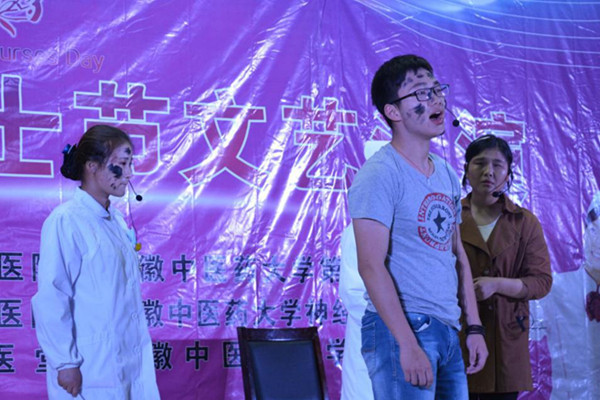 2016年5月11日晚6:30,安徽中医药大学第三届国际护士节大型文艺汇演在B301如约而至。晚会的一开始就给所有人一个大大的惊喜,伴着外教老师的琴音,三个大屏幕同步沙画展示,描述了我们从入校到最后离校所经历的事情。当六位帅气漂亮的主持人宣布晚会正式开始后,一个又一个精彩的节目展现给了观众。