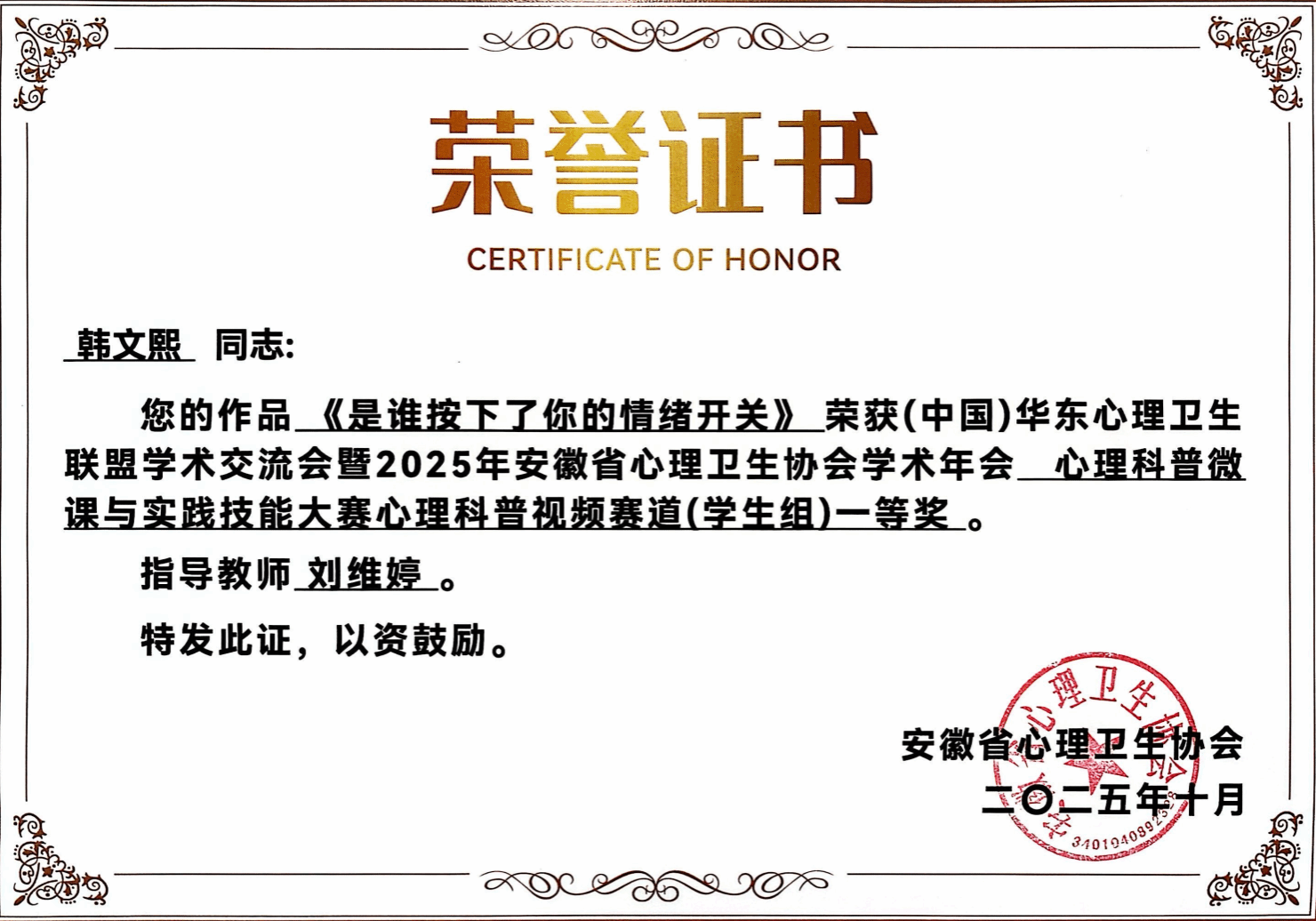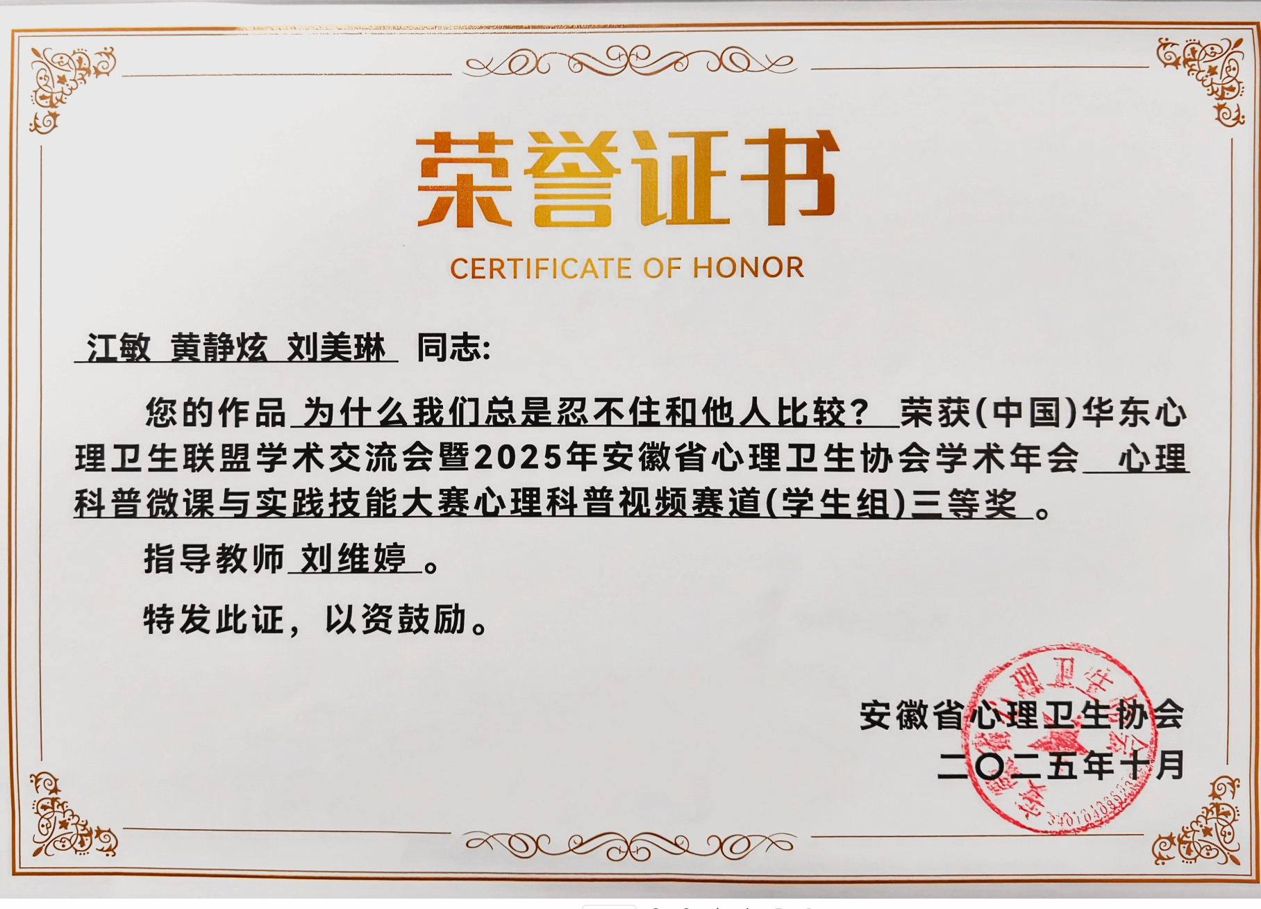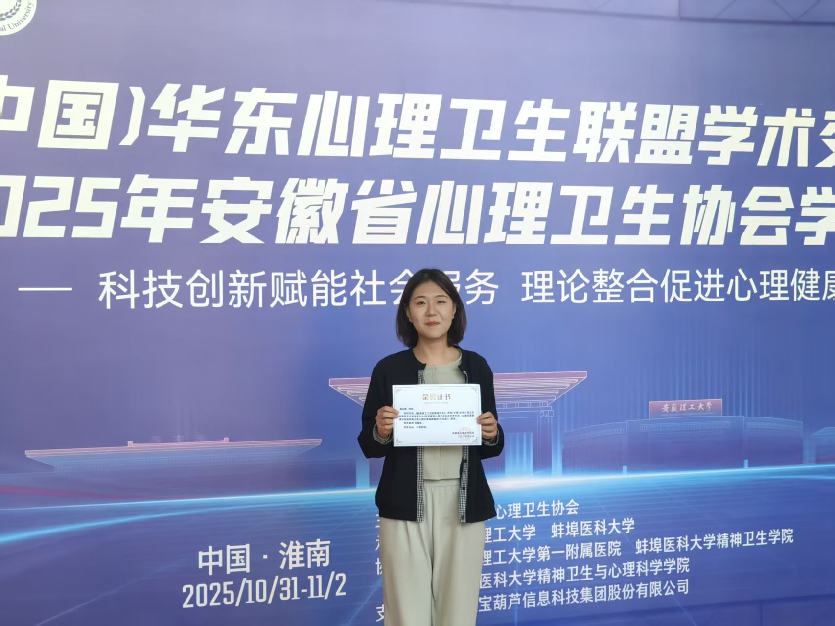 2025年11月2日,(中国)华东心理卫生联盟学术交流会暨2025年安徽省心理卫生协会学术年会圆满落幕。在同期举办的心理科普微课与实践技能大赛中,我校参赛学生表现优异,斩获佳绩。