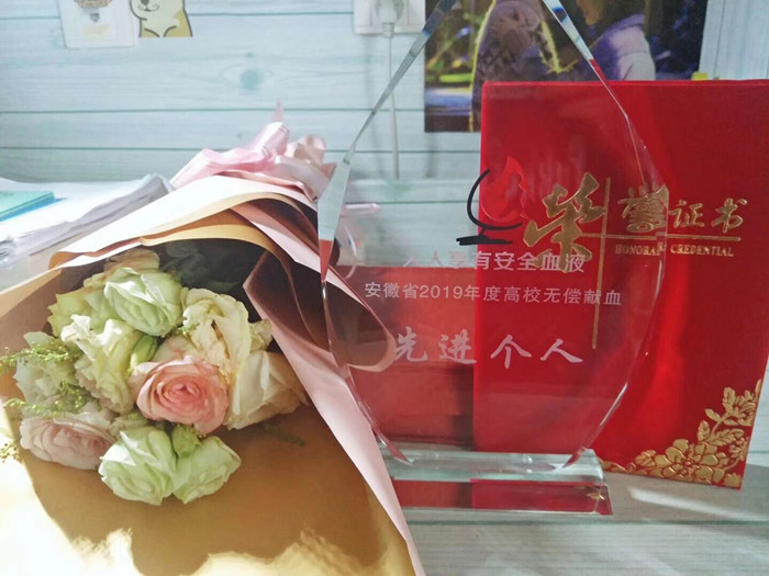 对医学事业的强烈兴趣和冥冥之中的缘分,怀着“愿为医学事业做贡献”的满腔热血,17岁的他成为安徽中医药大学yl9193永利官网的一名学生。一个学期的医学熏陶让他更加深刻明白医学事业和临床病人对血液的迫切需求,于是他默默决定,等到18周岁一定要去血站奉献自己的爱心。2018年2月,刚过完十八周岁生日的他,便来到合肥市中心血站,在经过一系列的检查后,他开始人生第一次献血,也是第一次捐献血小板。血小板的采集过程复杂且漫长,需经过一系列专业技术操作才能采集足够的血小板数量,每次采血时间在1.5小时左右,他却并没有任何怨言。自第一次捐献后就一直坚持,几乎是每个月都专门抽出时间前往血站进行无偿捐献。在仅仅一年三个月不到的时间里,小小年纪的他已经捐献血小板14次,共计26个献血量。他说:“自己参与无偿献血,是想帮助更多的人,每次献血,心里就会有一种成就感和满足感。之所以愿意坚持下去,也是因为想多为社会做一点贡献,毕竟校园中的我们所能做的事还不多,通过这样的方式奉献爱心就已经很有意义了。”