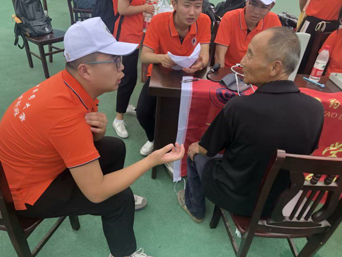 图为实践队员用通俗易懂的语言让老人更加了解高血压。 中国青年网通讯员 周想玲 提供