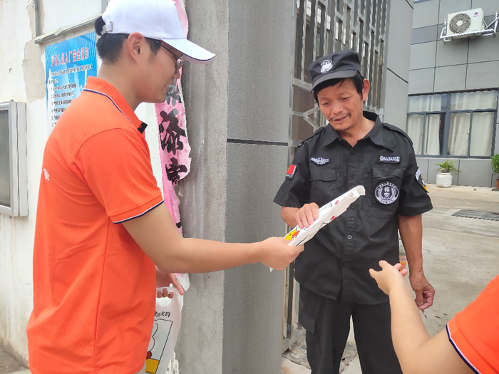 图为实践队员给有孙子的保安送上文具。中国青年网通讯员 周想玲 提供