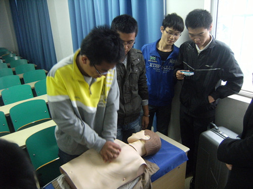 讲座开始,方海雁老师通过视频方式向大家引进话题,说明急救护理在日常生活中遇到紧急事件时的重要性,之后,她向大家介绍了在遇到紧急情况如触电、溺水、休克及心脏骤停情况下,大家应该如何进行正确的施救以确保患者的生命安全,最后,她又通过救治原理、抢救做法和抢救过程中的注意事项向大家以直观简洁的方式介绍了心肺复苏抢救方法,同学们也通过我们带去的人体模型现场进行了心肺复苏操作,方老师就同学们在操作中存在的问题进行了耐心的指导。