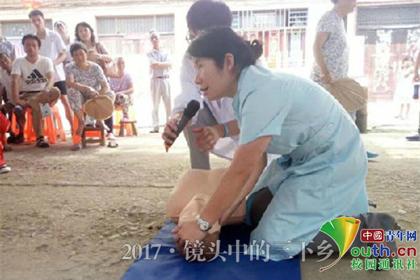 “由于急救知识的普遍缺乏,我国民众在遇到灾害和突发事件时,往往自救和互救能力低下,这也造成了很多完全能够避免的人身伤亡。尤其在医疗设备相对贫乏的农村地区,急救操作技能的普及显得尤为重要。”指导老师平跪在地面上,通过对人体模型的急救演习详细地演示了心肺复苏的操作步骤,并不忘对村民们提出的疑惑一一解答。