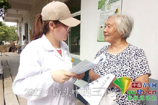 “奶奶,我们是下乡的大学生,来这里看望你们,给你们检查身体。”听了志愿者的解释,老人不住的点头喊着着好孩子,一路紧紧攥着志愿者的手。
