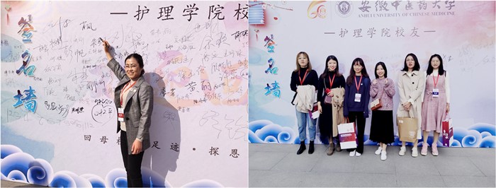 在护理楼门前,校友们在志愿者的引导下,纷纷驻足,在签名墙上留下自己的签名并合影留念。