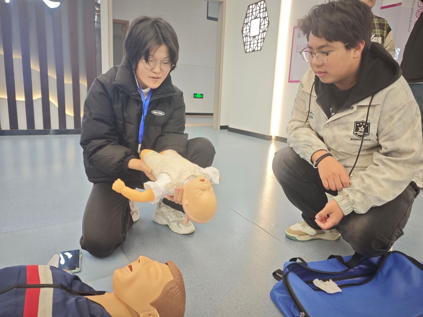 生命守护倾心力,绿色同行筑梦基。活动采用盲盒抽签机制,分为“环保行动”“急救宣传”两个板块,参与者随机抽取纸条,完成对应任务。抽中“环保行动”任务,需完成垃圾分类等环保知识问答,或投身校园垃圾清理行动;抽中“急救宣传”任务,则参与止血包扎、中暑处理、AED使用等知识竞答,或开展心肺复苏、海姆立克急救法等技能实训。同学们踊跃参与,践行绿色理念,提升急救技能,现场气氛热烈非凡。