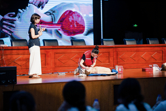 培训中,袁娟老师结合案例与视频,重点讲解心肺复苏操作步骤及AED使用方法,强调急救技能的重要性。随后,她与2023级中医护理学研究生李大进、2024级中医护理学研究生宋婧雯共同示范心肺复苏实操流程及注意事项,引导志愿者亲身体验,巩固理论知识。