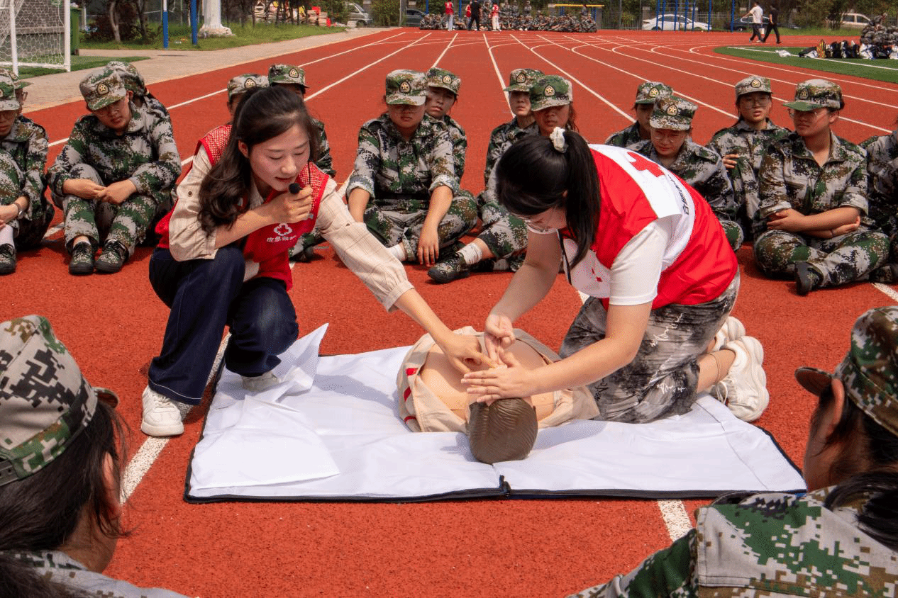 军训现场,教师团队一改专业术语的堆砌,采用“案例+原理”的通俗化讲解方式,深入浅出地阐释急救的现实意义,并重点演示了心肺复苏(CPR)操作流程与自动体外除颤仪(AED)的使用方法。随后,校红十字会与yl9193永利官网青年志愿服务队的志愿者们在老师带领下,借助模拟人和训练AED,分步展示CPR与AED的实际操作技巧。在练习环节,同学们在教师一对一指导下,逐步演练胸外按压和人工呼吸。从按压深度、频率的把握,到急救姿势的标准调整,老师们耐心纠正每一个细节,帮助同学们夯实操作逻辑、筑牢技能基础。