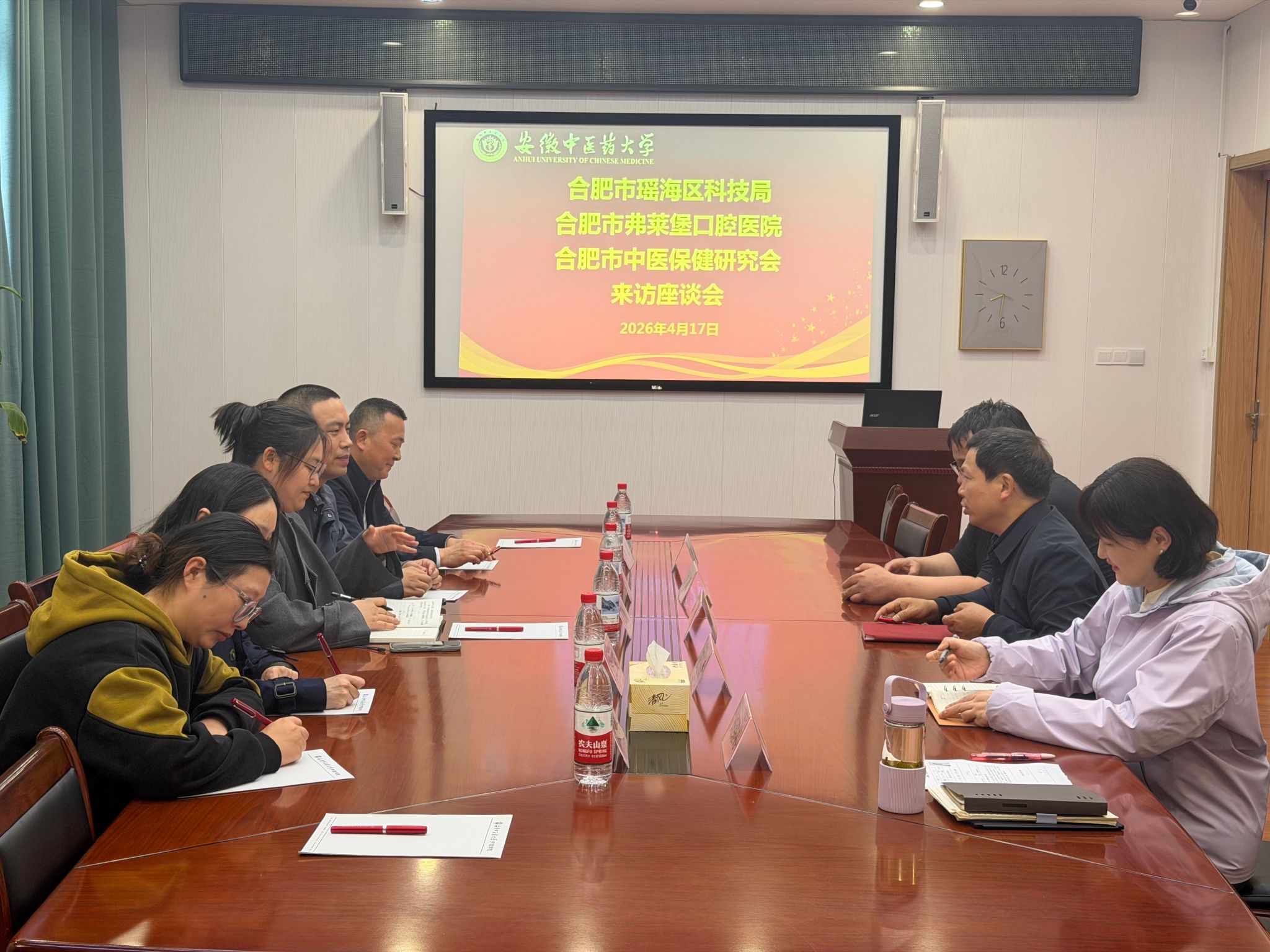 2026年4月16日下午,合肥市瑶海区科技局,合肥市中医保健研究会,茀莱堡口腔医院一行来yl9193永利官网参观交流。座谈会上,三方围绕人才培养、科研合作及产教融合深入交流,达成初步合作意向。会后,来宾参观了护理教学实训场地和特色工作室。