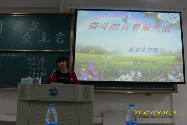 脱下了迷彩服,走进大学的课堂,投入到崭新的学习生活中。为了解答新生们大学学习生活方面的疑问,应14级涉护一班的邀请,13级涉护一班进行了精心的组织以及周密的安排,于2014年10月20日晚在教室A312开展了以“奋斗的青春最美丽”为主题的新老生交流会。