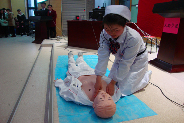 在主持人简短的开场白之后,比赛正式拉开序幕。比赛共分三个环节:知识问答,技能操作及护理礼仪表演。第一环节首先是小组必答题,各大组势均力敌,稳定作答,相差无几。接下来的抢答题,由参赛选手用抢答器进行抢答,但由于各组抢答经验不够,导致各别小组处于劣势,场面扣人心弦,观众都屏息静听。最令人紧张刺激的还是风险题,各组以丰富知识与智慧赢得了一阵阵掌声。在接下来的观众互动中,同学们以极高的热情将全场气氛推向高潮。第二环节的CPR技术操作。6组各派出一名选手进行操作,体现了极其认真专业的水平。伴随着优雅的音乐声,比赛进入最后环节,护理礼仪表演。陆续出场的白衣天使,如一缕春风,平凡优雅的动作轻诉着这份最崇高的事业。