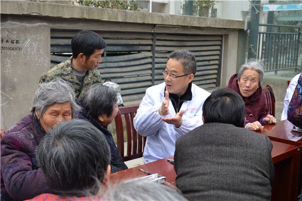 义诊活动一开始就受到了社区居民的热情支持。这边横幅刚挂上,那边就有结伴的人前来咨询。作为周边唯一一个医学院校,我们和磨店居民早就打成一片。在做了场地的布置和基本设施的安置之后,我们的白衣天使们就开始有条不紊的安排大家接受义诊。牛忠军一边为居民们问诊号脉,一边与老人们拉着家常,在和他们的交谈中了解老人们的生活习惯。作为学生的我们,能从中很深刻的体会到牛老师对于社区人民的关心,这也许就是我们医学人最本能的表达吧!