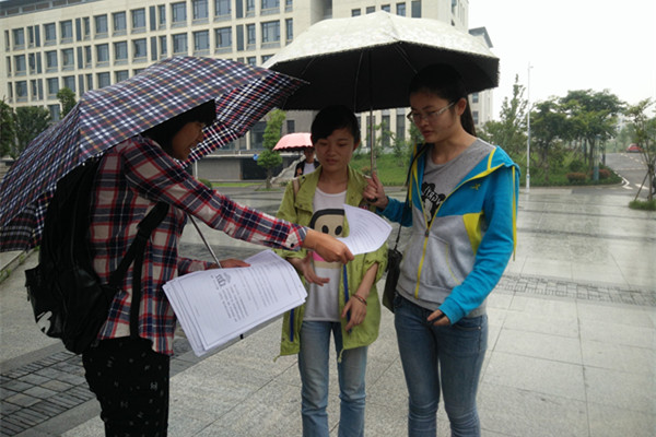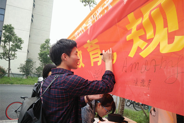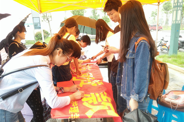 当日天公不作美,小雨连绵不绝,但志愿者们热情不减,积极向往来的学生派发有关诚信签字活动的宣传单,并号召学生们在诚信横幅上签自己的名字,为诚信教育活动献出一份力。在志愿者们的宣传下,往来学生纷纷驻足,争先恐后的在横幅上签字,并希望能为自己的诚信刻下永久的印迹、留下熠熠生辉的奖章。