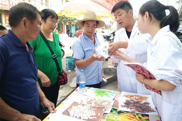 杏林一脉传千古,中医古药传古今。历史是文化的积淀,中国医学有几千年的历史,然而随着西方医学的不断发展中医文化的处境显得相当尴尬。因此志愿者们向当地居民发放"中医健康小贴士"并摆出各种中药材的图片,邀请广大群众通过观察图片辨别药名,答对者则赠送一些日常所需药品。当地居民踊跃参加,300多份药品无一剩余。此次活动使当地居民对一些用途常见的药材有了更深入的了解同时使中医文化得到传扬。