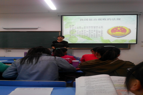此次主题班会,班长向同学们介绍了古今中外的一些贪腐情况,列举了和珅,薄熙来等一些贪官的事例,以此来说明贪腐现象随着时代的发展也是一直存在的。并且,由这些比较大的贪腐事件联想到我们周围生活中的小腐败问题。比如:学校班级上在班费使用上可能出现的虚报现象,和我们工作以后关于“医院红包”问题。辅导员让我们设身处地地去想,如果在以后工作中,有人向你替红包,你该如何处理?在面对各种“贪”的诱惑时,该如何应对?这些问题让同学们陷入的沉思。