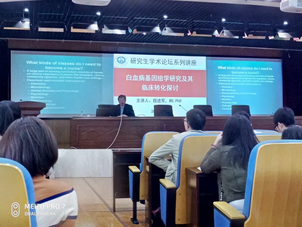 程博士主要围绕以下两个内容展开讲座:白血病基因组学研究及其临床转化探讨以及美国护理相关情况简介。随后,程博士与现场的教师和学生进行了交流与讨论,讲座反响良好。(朱宇/文,张贻婷/图)