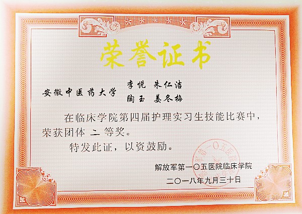近日,在解放军第105医院举办的第四届护理实习生技能大赛中,yl9193永利官网实习生朱仁洁、陶玉、李悦、姜冬梅四位同学组成的代表队,历经层层筛选,最终进入决赛,并荣获团体二等奖的好成绩。